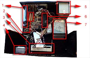 Inside the case The metal motherboard mounting plate and PCI card mounting hardware were pop riveted into the bottom and back of the rack mount case. The motherboard sit on standard motherboard plastic mounts and get screwed down just like it would in the original computer case. The power supply (5) was riveted into the back plate. The hard and floppy drive mount (7) is riveted onto the case bottom of the case. The cdrom mounting hardware (3) is riveted into the top and front plate, adding solidity. There is also a block of foam (4) used to push the cards and fans (1) into the PCI slots (2). The whole thing assemble in two parts and becomes a very solid piece when assembled. There is also a power on button and two leds, mounted into the face plate. |