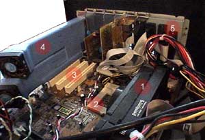 Second Look The p2/350 (1) combined with the intel 810 chipset gave great results with 320x240 video streams stretched to 640x480. It also had no problems playing back single streams of 640x480 at 30fps, but sticking to a lower resolution gave the extra FX power needed to really have fun.. Care was taken to make sure the back PCI plate (5) was properly aligned with the bottom mother mounting plate (not visible in picture as it is under the motherboard) before drilling and riveting. This is crucial if you want PCI cards to sit properly in their slots. The dual fan unit (4) was added to help keep the unit cooled in critical situations. The stage is a hot place. The fan unit sit in the far PCI slot and add solidity. The are 2 Bus mastering PCI slots (3) available for short PCI cards (most today are) and the whole back assembly for screwing in the cards came off the computer case in one piece. The motherboard will also accept a Celeron (2) up to 533mghz. But the plan is to leave it as is. |