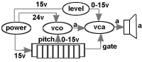 The first module in the synth chain is the oscillator. This is a simple circuit that produces a tone when it is turned on. It has two separate kinds of power coming to it. The first powers the circuit itself and the second is used to make the circuit change its pitch. You vary the second voltage in small increments form 0 to 15 volts to go from the lowest to highest pitch. This is where the term VCO comes from. It stands for voltage controlled oscillator.