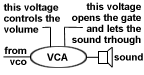 If you understood VCO you know what VCA actually means. The sound emitted by the VCO goes through the VCA. The VCA is a small amplifier circuit. It has two types of control. One is just like the VCO control but instead of pitch it controls the overall volume of the sound going out. The other is a simple switch that either lets the sound through or not. This second part of the VCA is called a gate.