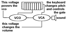 Now what happens is that no sound comes out of the synth unless you press a key. When you do press a key the VCO changes it's pitch according to what voltage it receives. The contact you make when pressing the key causes the gate to let the sound out. pretty neat huh ?